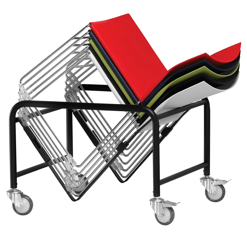 Kunststoffstuhl auf einem dünnen Kufen Gestell. Ein modernes und leicht wirkendes Design, welches ein hochwertiges und bequemes Sitzen garantiert. Der Stuhl ist für öffentliche Räume mit multifunktionaler Nutzung geeignet. Er erfüllt hohe Ansprüche beim Stapeln (bis zu 45 Stück auf einem Transportwagen). Kunststofffarben – schwarz und weiß. Erweiterte Kunststofffarben – blau, rot, grün, Sand und grau. Optional mit Schreibtablar, Griffloch, Reihenverbindern oder Paniksicherung.